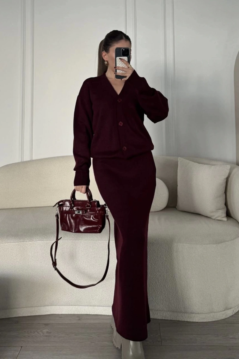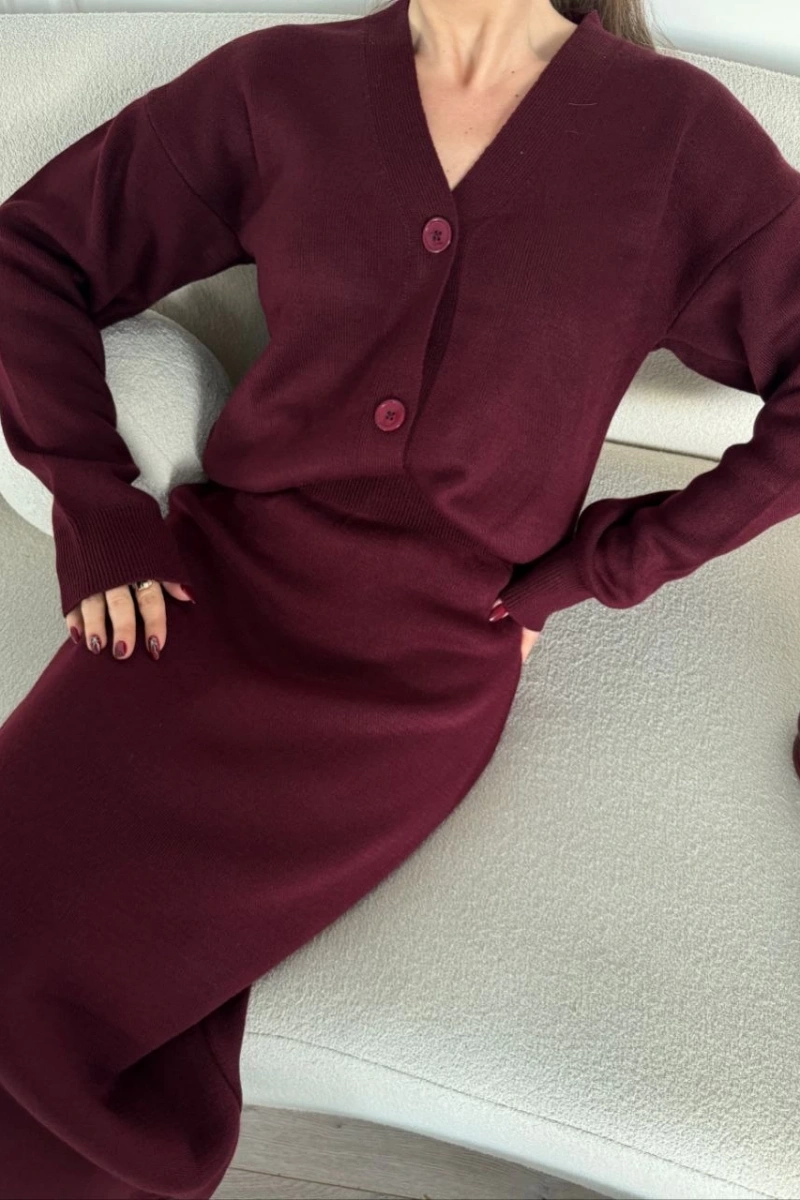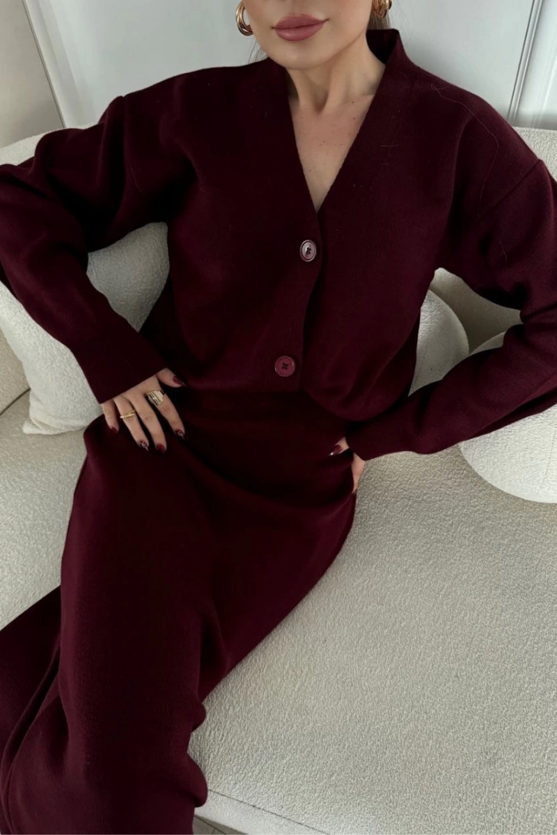 V Yaka 3 Düğmeli Hırka Takım Triko İkili Etekli - Bordo