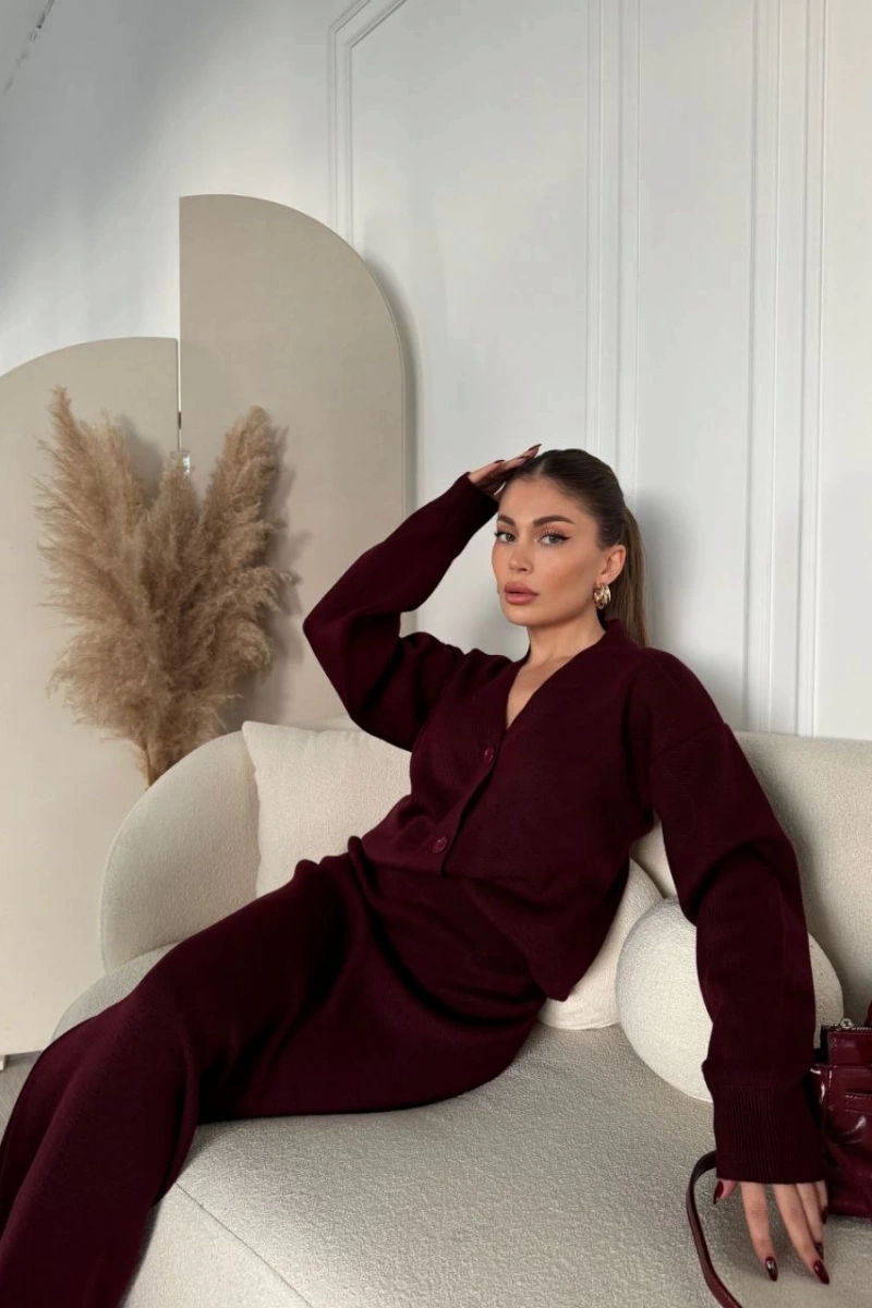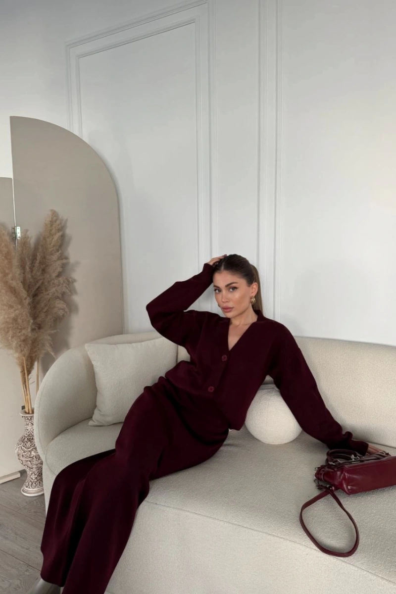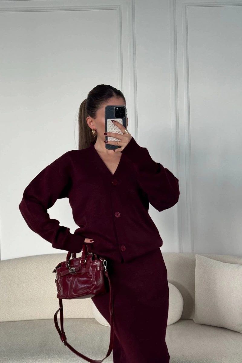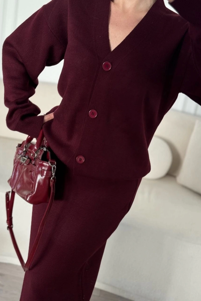 V Yaka 3 Düğmeli Hırka Takım Triko İkili Etekli - Bordo