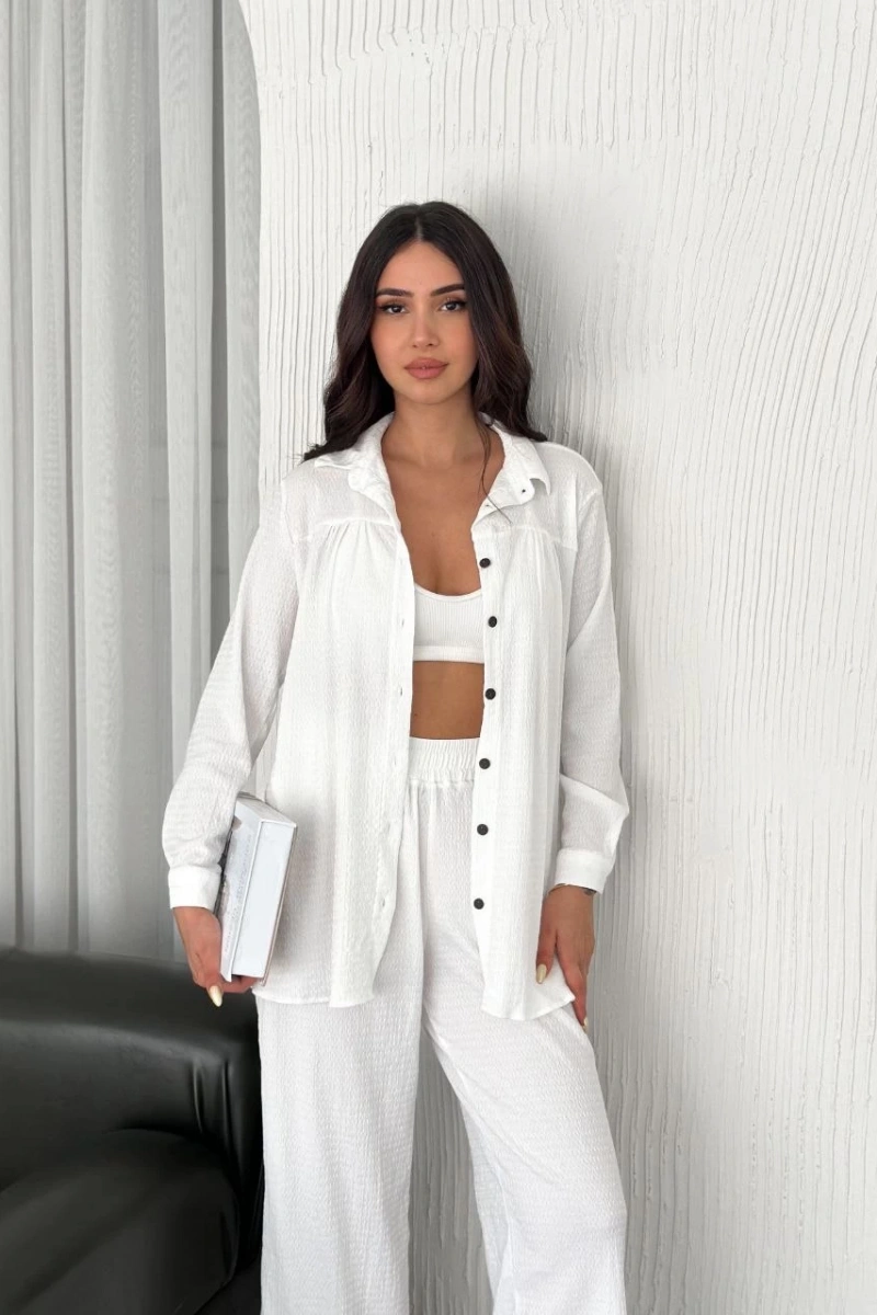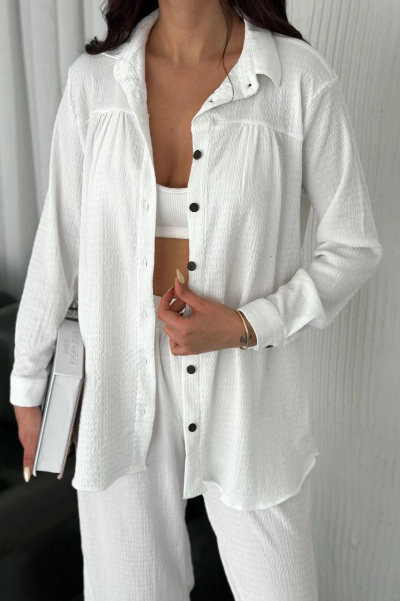 Yakalı Düğmeli Uzun Kollu Gömlek Pantolon ikili Takım - Beyaz