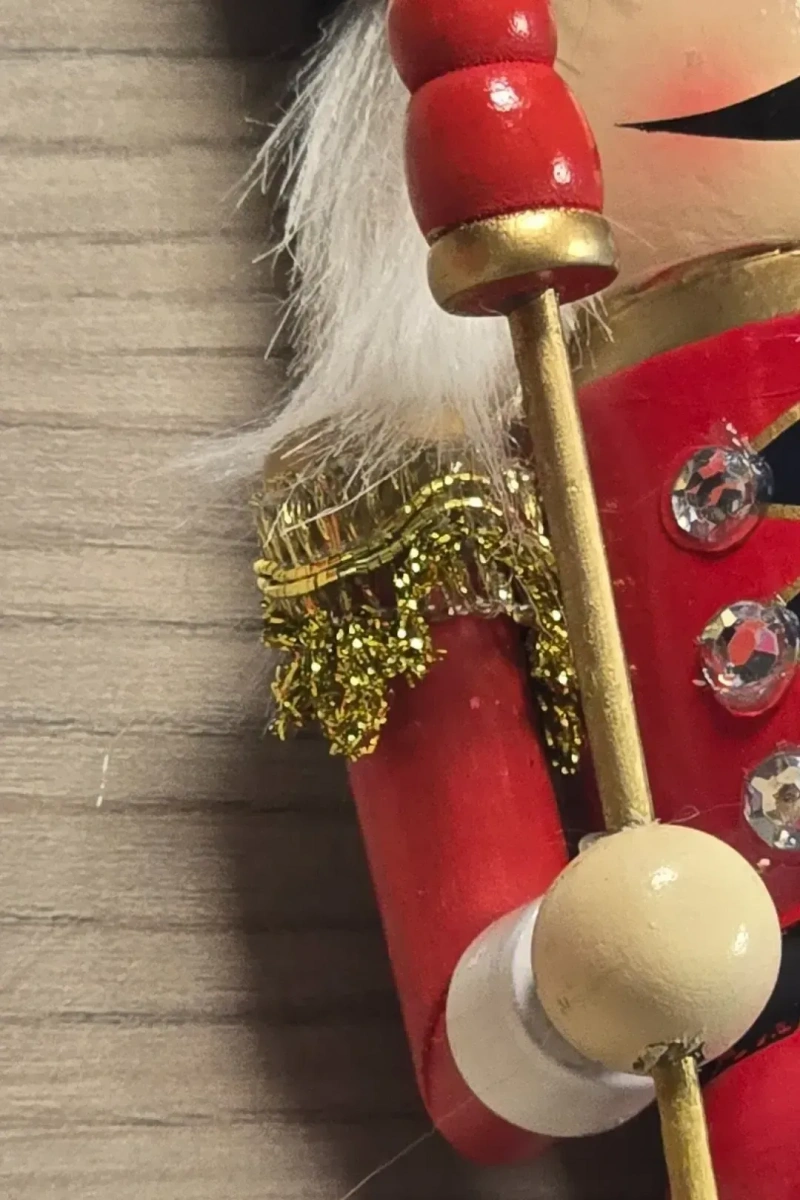 Ahşap askerler serisinden Noel süsü; kırmızı/siyah üniformalı, altın detaylı ve siyah kürk şapkalı asker.